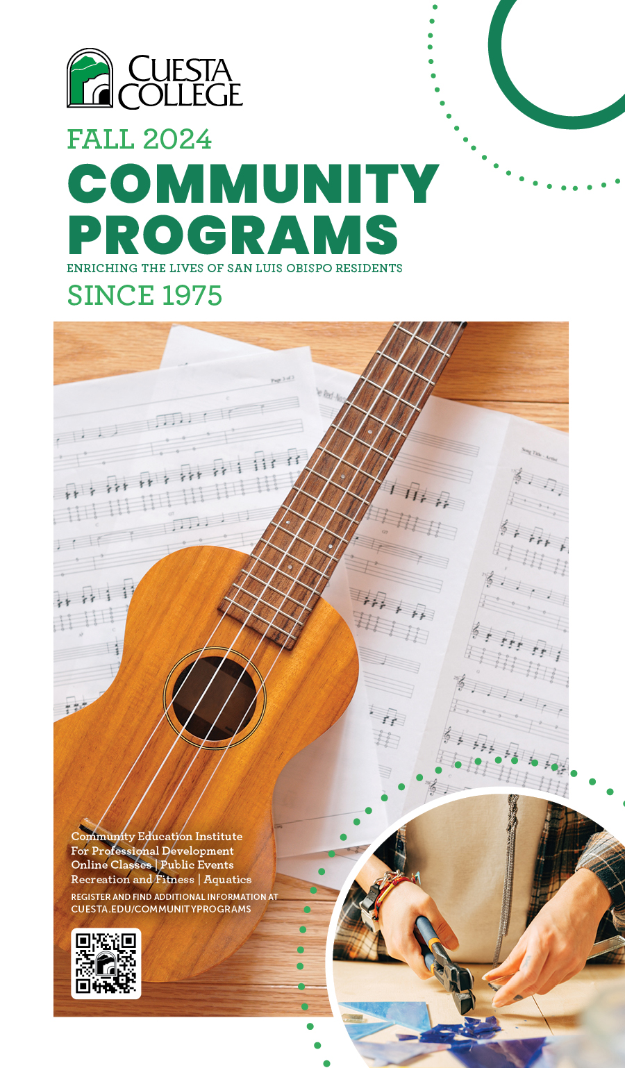 Cuesta College Community Programs has made every reasonable effort to determine that the following activity brochures are accurate. Courses and programs offered, together with other matters contained herein, are subject to change without notice by the Community Programs administration for reasons related to student enrollment, level of financial support, or for any other reason, at the discretion of the College.